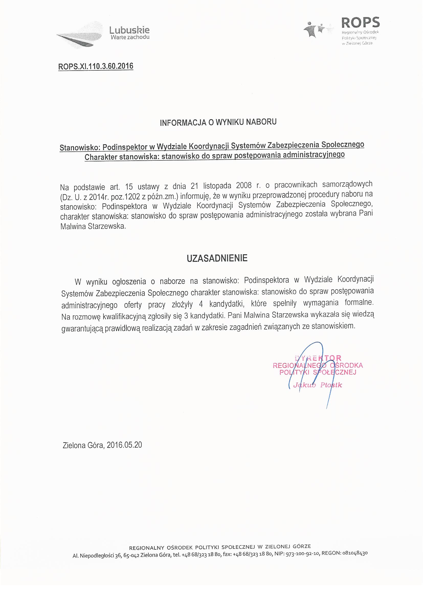 Na podstawie art. 15 ustawy z dnia 21 listopada 2008 r. o pracownikach samorządowych (Dz. U. z 2014r. poz.1202 z późn.zm.) informuję, że w wyniku przeprowadzonej procedury naboru na stanowisko: Podinspektora w Wydziale Koordynacji Systemów Zabezpieczenia Społecznego, charakter stanowiska: stanowisko do spraw postępowania administracyjnego została wybrana Pani Malwina Starzewska.