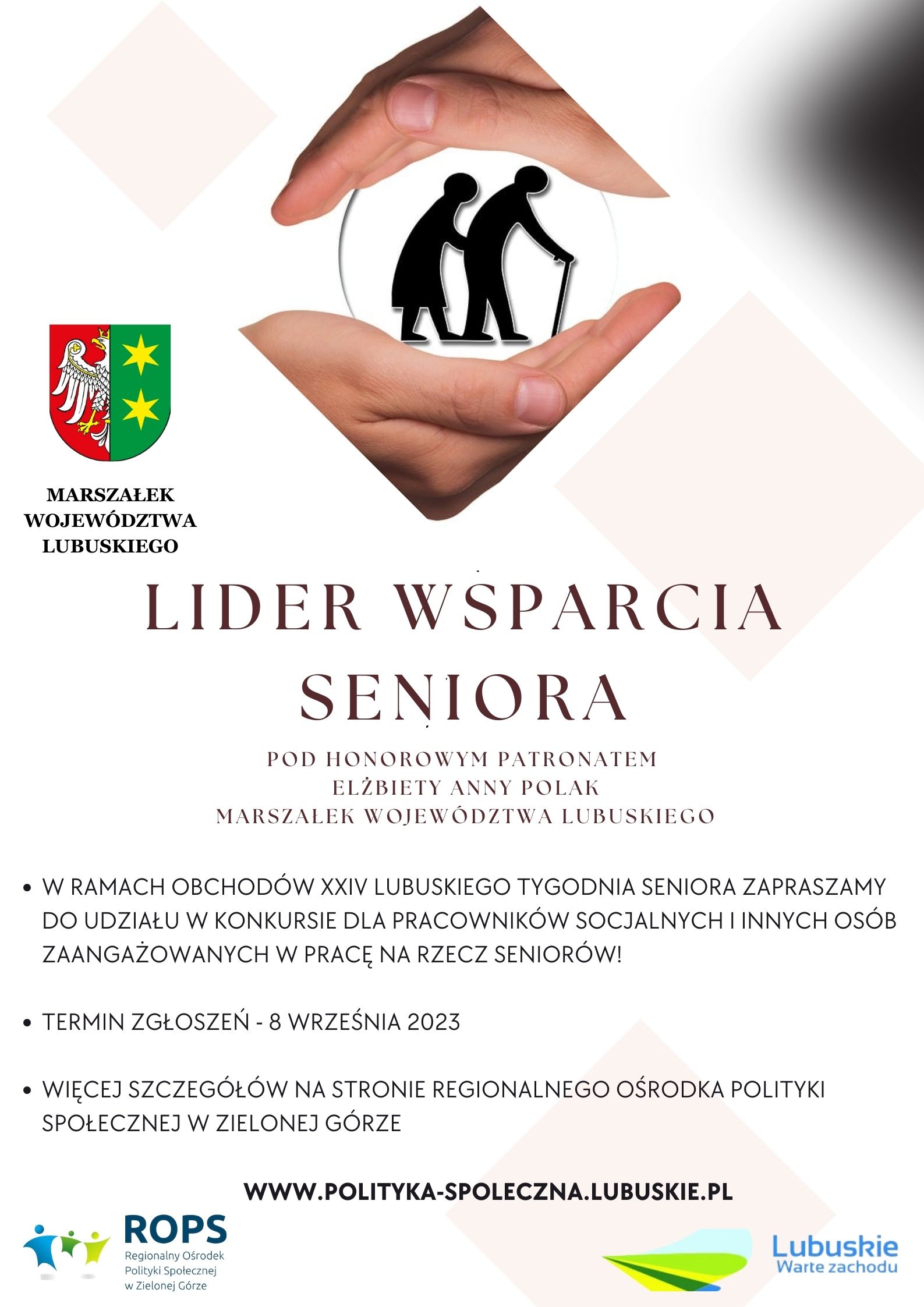Regionalny Ośrodek Polityki Społecznej w Zielonej Górze uprzejmie informuje, że w ramach tegorocznych obchodów XXIV Lubuskiego Tygodnia Seniora ogłasza konkurs pn.: „Lider Wsparcia Seniora” – konkurs dla lubuskich pracowników socjalnych i innych osób zaangażowanych w pracę na rzecz seniorów, pod honorowym patronatem Marszałek Województwa Lubuskiego Elżbiety Anny Polak.
