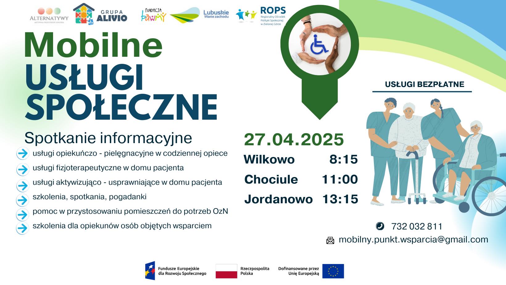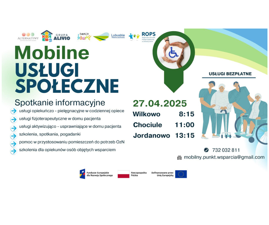 27 kwietnia 2025 roku na terenie 3 miejscowości gminy Świebodzin, odbędą się spotkania informacyjne inaugurujące innowacyjny projekt pn.: „MOBILNE USŁUGI SPOŁECZNE”, którego celem jest dostarczenie specjalistycznych usług społecznych bezpośrednio do mieszkańców terenów wiejskich gminy Świebodzin.