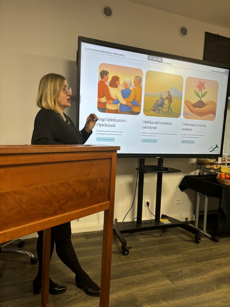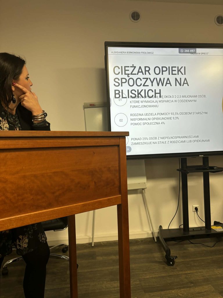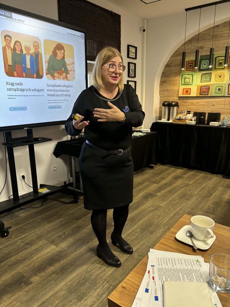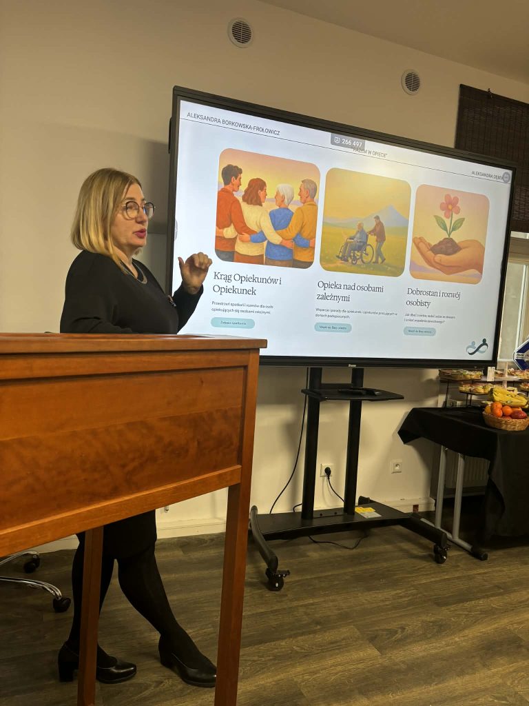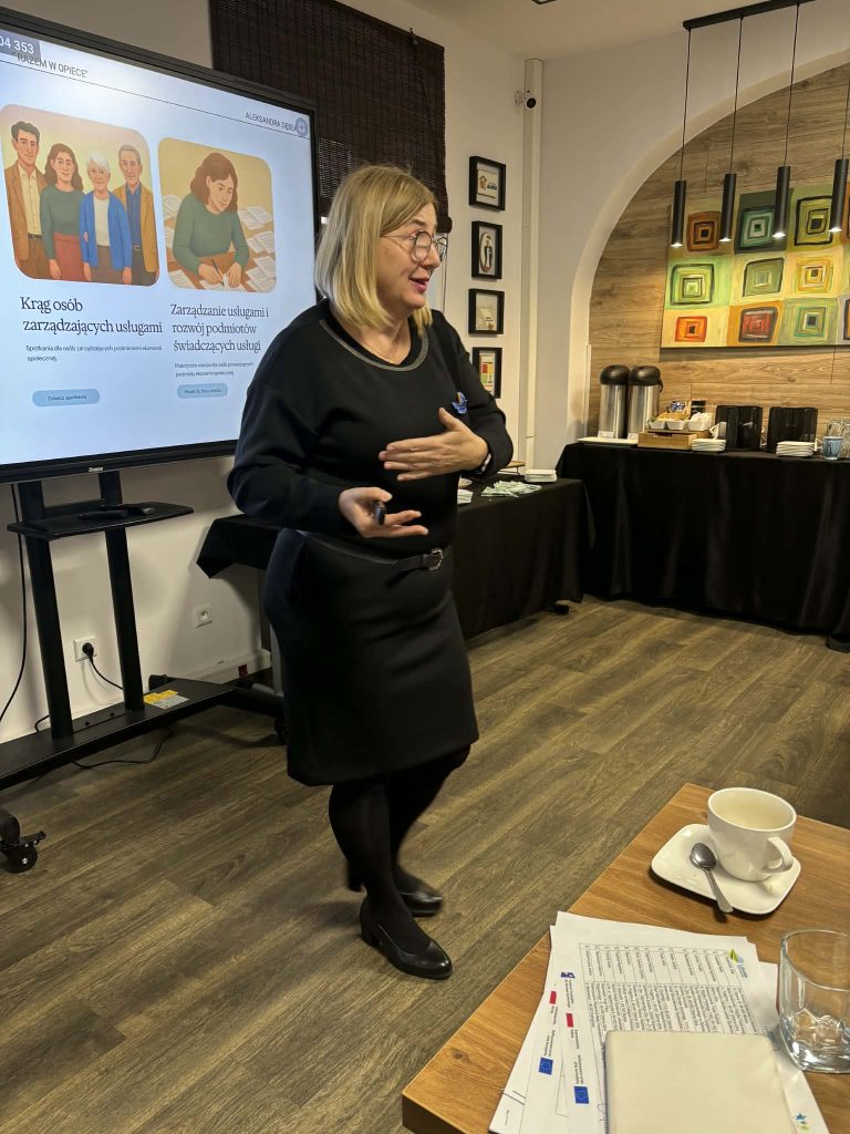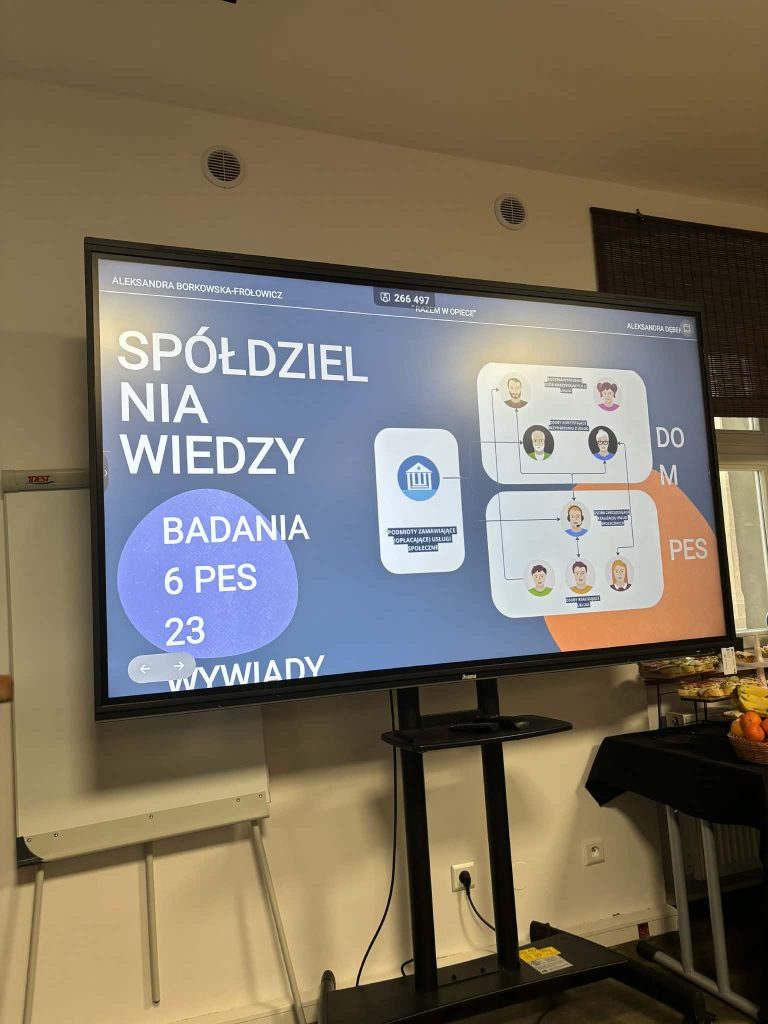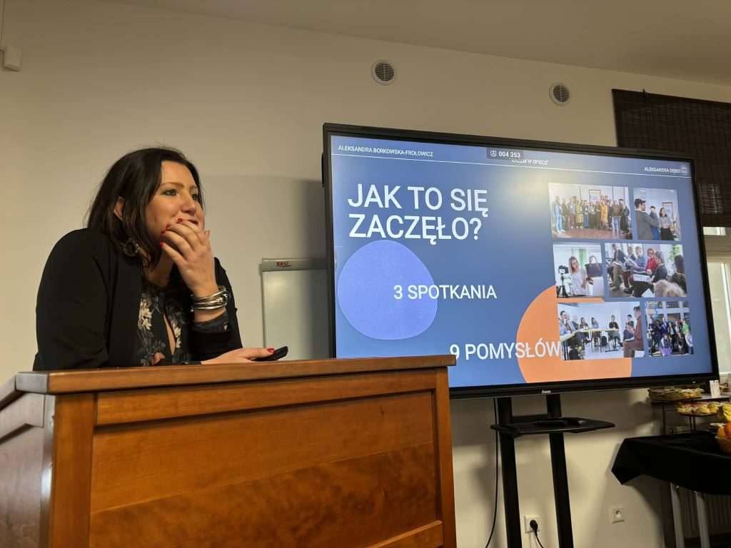 jednym z punktów spotkania była także prezentacja innowacji społecznej tj. strony „Razem w opiece” https://www.razemwopiece.pl/ jest to platforma współpracy i wymiany wiedzy dla osób pracujących w sektorze opieki. Innowację przedstawiły ekspertki Aleksandra Borkowska – Frołowicz (Spółdzielnia Socjalna Grupa Alivio Spn.s.) oraz Aleksandra Dębek (@Spółdzielnia Socjalna Alternatywy).