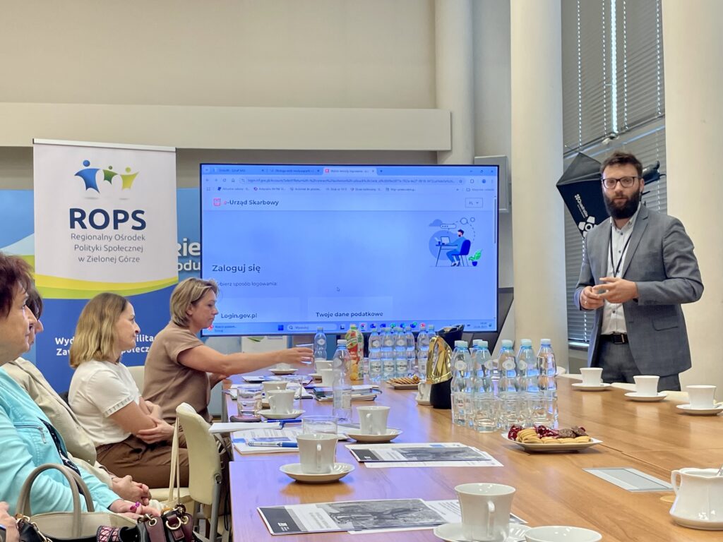Wśród zaproszonych prelegentów znaleźli się przedstawiciele Zakładu Ubezpieczeń Społecznych oraz Urzędu Skarbowego. Pani Agnieszka Kazoń, Naczelnik Wydziału Organizacji i Analiz Oddziału ZUS w Zielonej Górze oraz Pani Aurelia Kowalczuk, Starszy Specjalista Wydziału Obsługi Klienta i Korespondencji zaprezentowały zakres działań ZUS dedykowanych osobom starszym i osobom z niepełnosprawnościami. Uczestnicy mogli zapoznać się m.in. z informacjami dotyczącymi świadczeń, dodatków do rent i emerytur, możliwości rehabilitacji leczniczej, a także dowiedzieć się, w jaki sposób można elektronicznie umawiać się na wizyty w ZUS oraz korzystać z coraz szerszej oferty usług online.