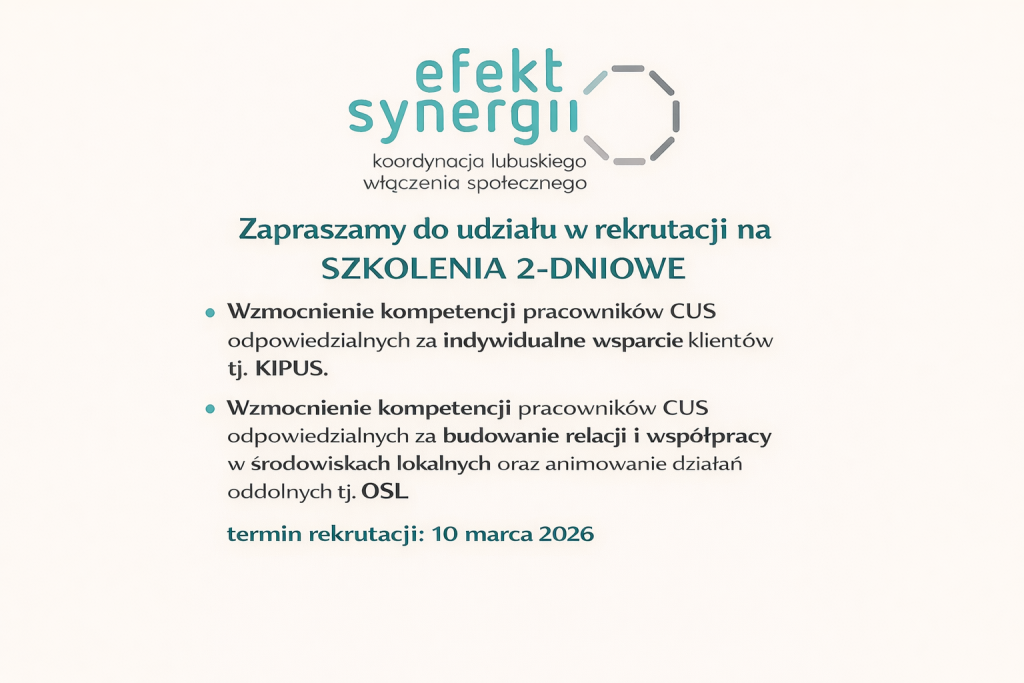 Zespół Wydziału realizuje projekt „Efekt Synergii – koordynacja lubuskiego włączenia społecznego. Czas jego realizacji: 01.07.2023 r. do 31.12.2028 r.
