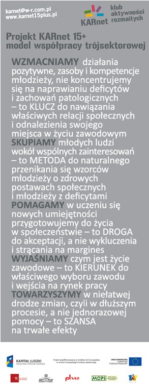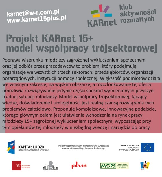 Regionalny Ośrodek Polityki Społecznej w Zielonej Górze informuje, że Wrocławska Rewitalizacja Sp. z o.o. rozpoczyna kolejny etap realizacji projektu „KARnet 15+ – model współpracy trójsektorowej”, w trakcie którego testowane będą innowacyjne metody rozwiązywania problemów młodzieży zagrożonej wykluczeniem społecznym.