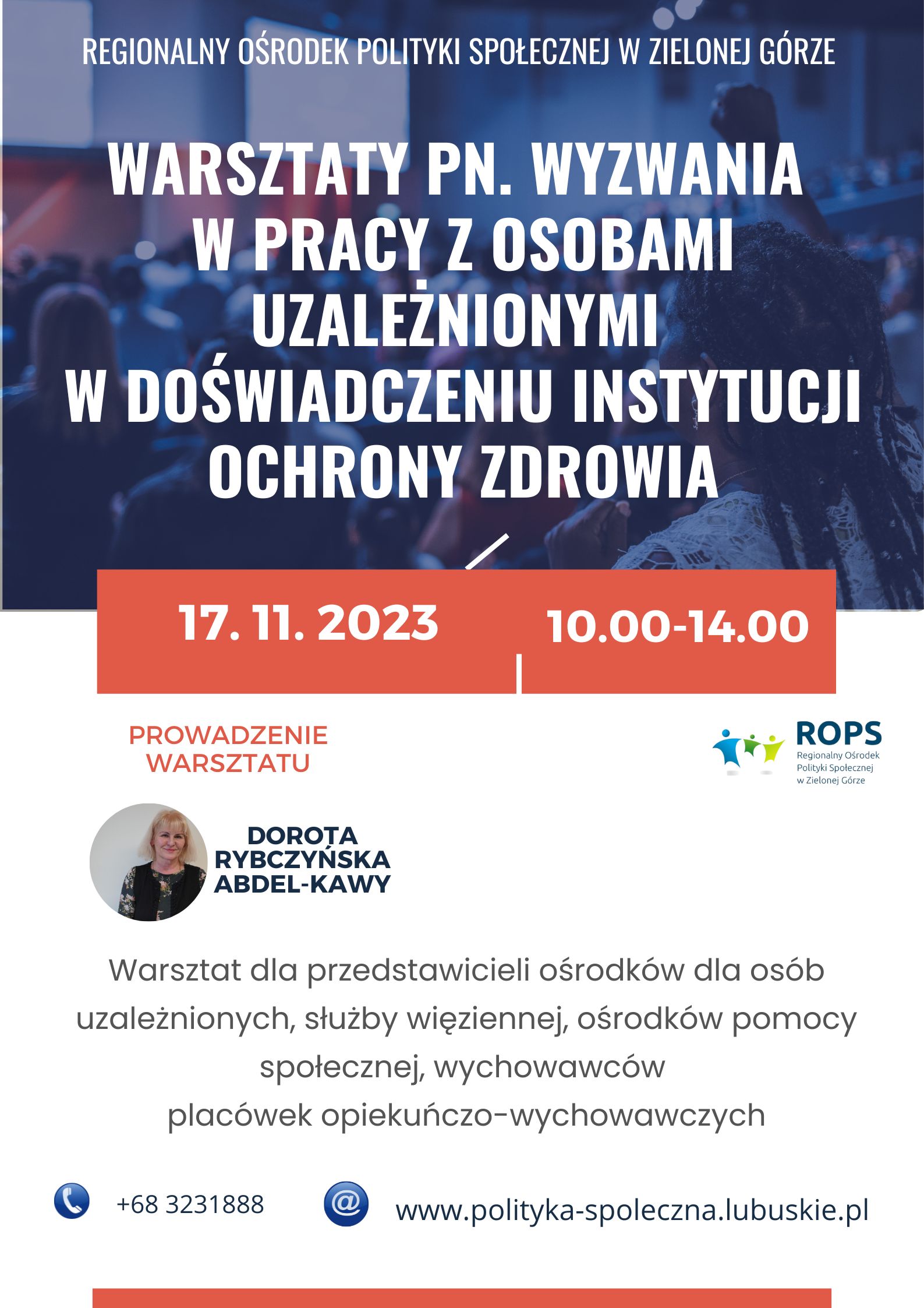 Regionalny Ośrodek Polityki Społecznej w Zielonej Górze uprzejmie informuje, że w dniu 17.11.2023 r. odbędą się warsztaty z zakresu przeciwdziałania narkomanii pn. „Wyzwania w pracy z osobami uzależnionymi w doświadczeniu instytucji ochrony zdrowia”.